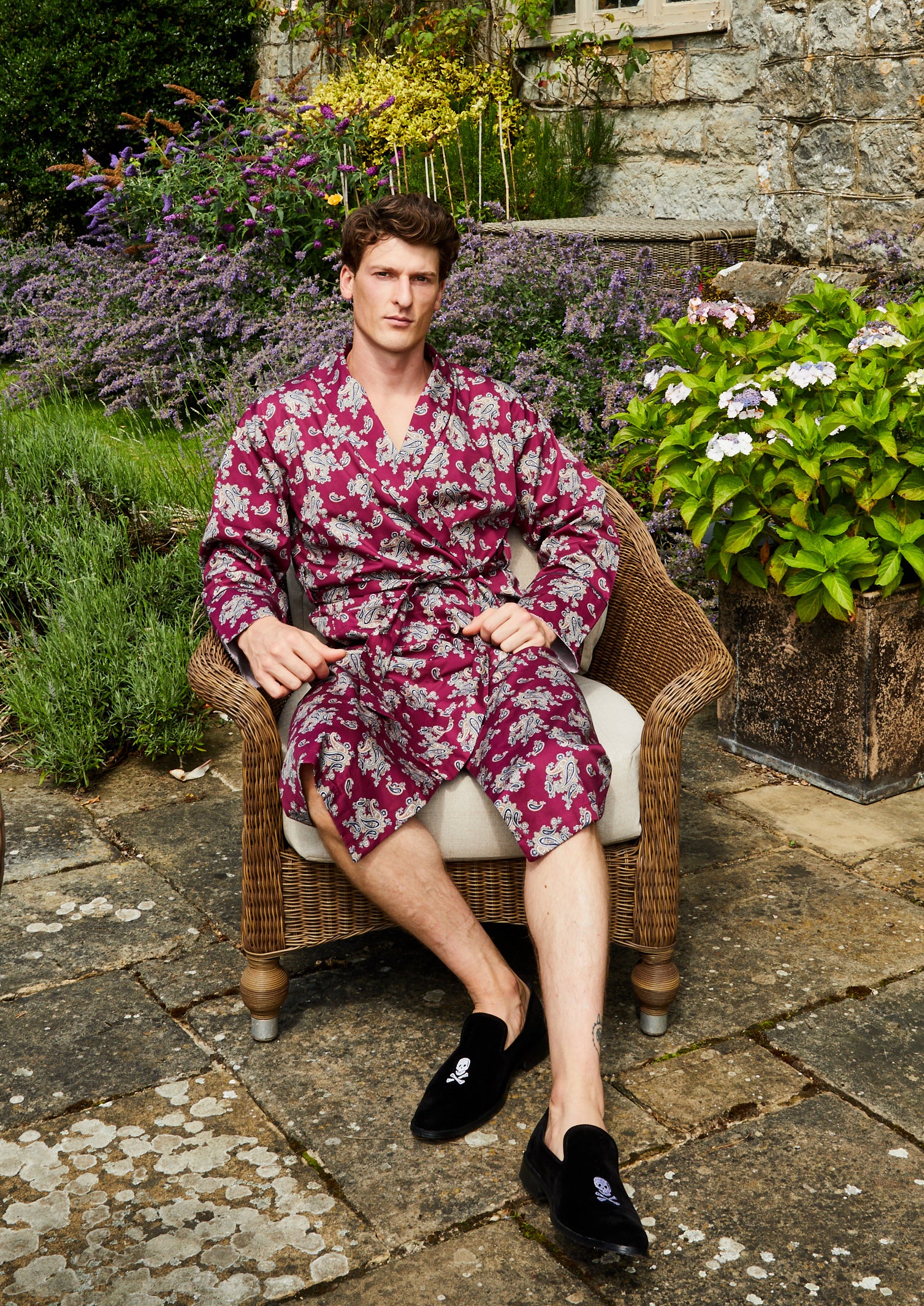 Gatsby ist einer unserer neuesten leichten Bademäntel für Herren in einem satten Burgunderweinton mit auffälligem Paisleymuster und kontrastierenden Paspeln an den Ärmeln.