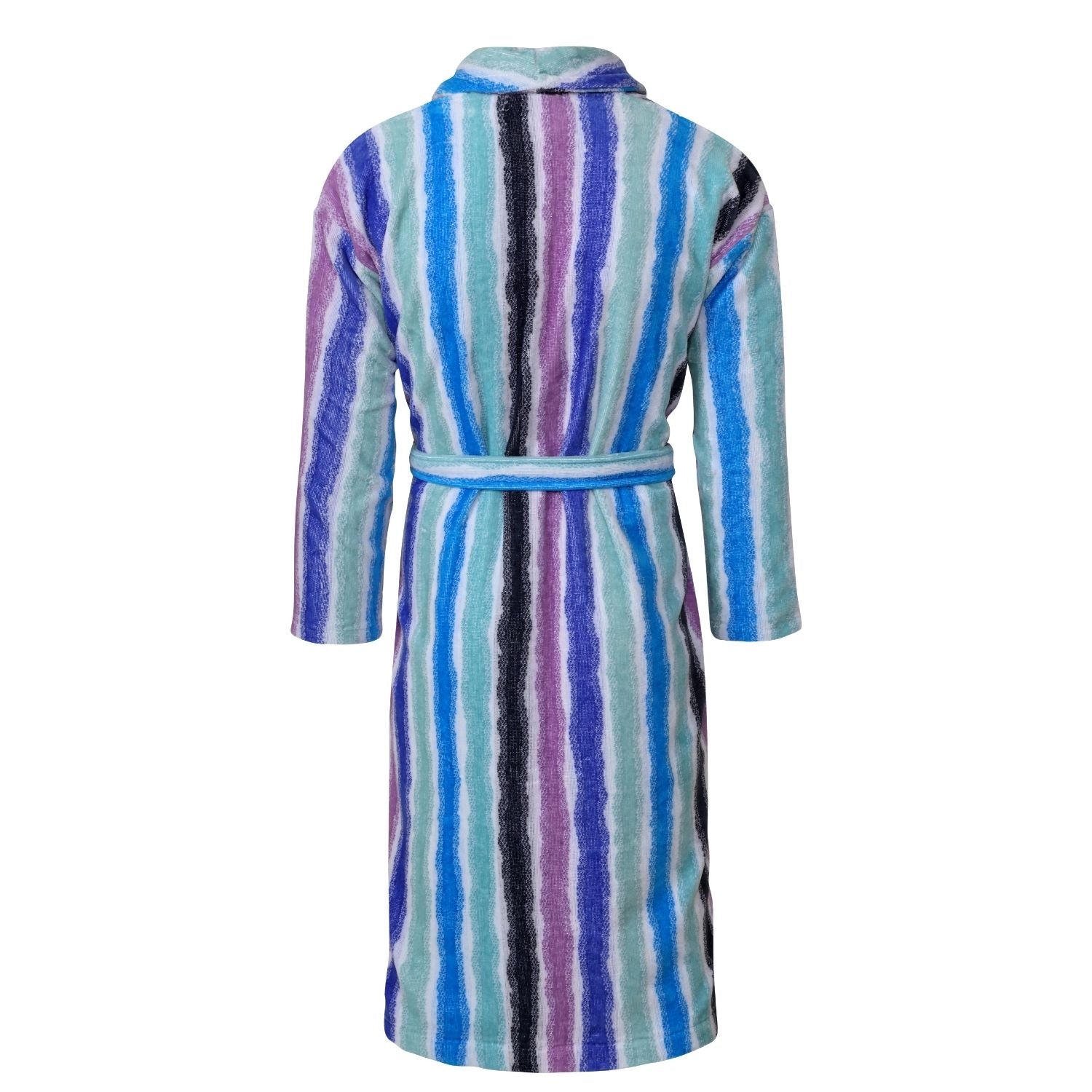 Feste Streifen sind ersetzt durch vage Linien, die in einem kühlen, erfrischenden Weiß erblassen. Eine unerwartete Farbpalette vermischt Mint, Kornblumen-Blau, Immmergrün, Azurblau und Marineblau. Der Sunset ist ein schlichter Bademantel für Frauen, die einen ruhigen Morgenmantel genießen.