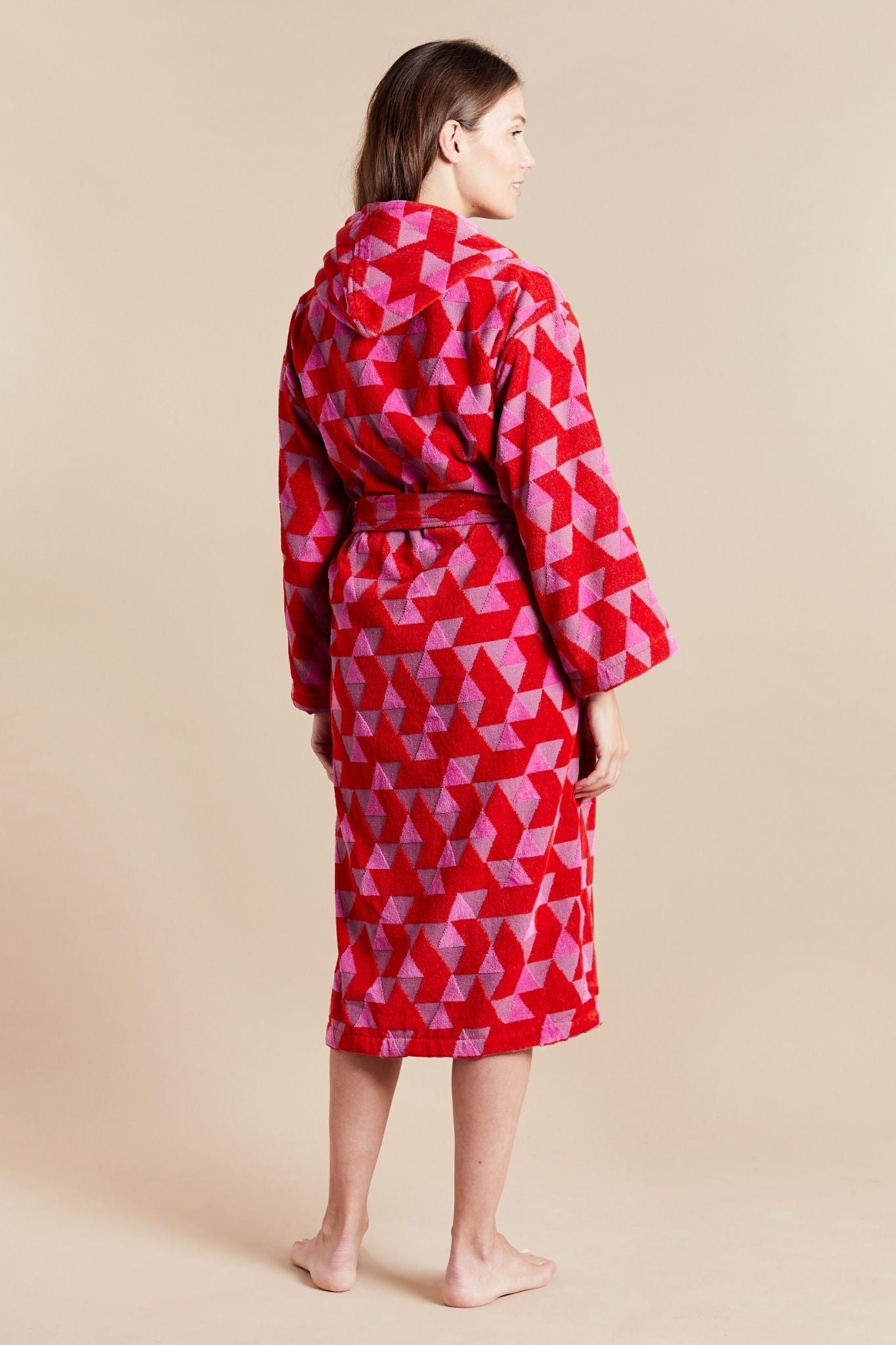 Setzen Sie sich mit diesem knalligen Bademantel mit Pyramiden und Diamant-Formen gekonnt in Szene. Hot Pink und Lippenstiftrot werden durch ein zartes Mauve abgemildert. Das Ergebnis ist auffällig, aber elegant.